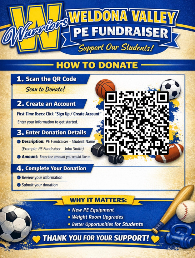 Help us get stronger! The PE students are doing a fundraiser to help raise money for new PE and Weight Room Equipment! Your donations can be sent in cash or check or call the school! Below is also the option to donate online! Just scan the QR code and set up an account! Please be sure you leave the student's name so they get credit for each donation! See the flyer for more information! Thank you for all of your support and GO WARRIORS!
